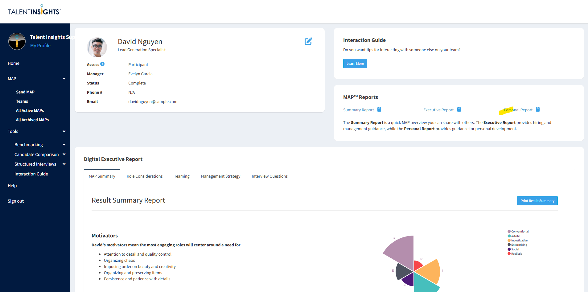 Results from the Talent Insights MAP (Multi Assessment Profile) can be viewed in three different Report formats: Summary, Personal, Executive.