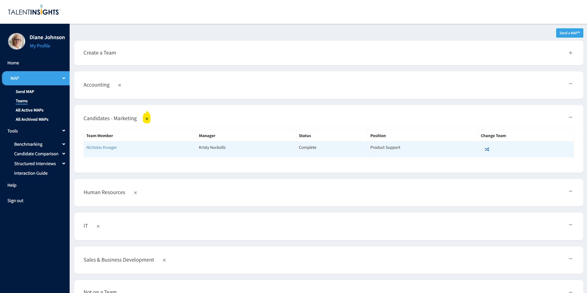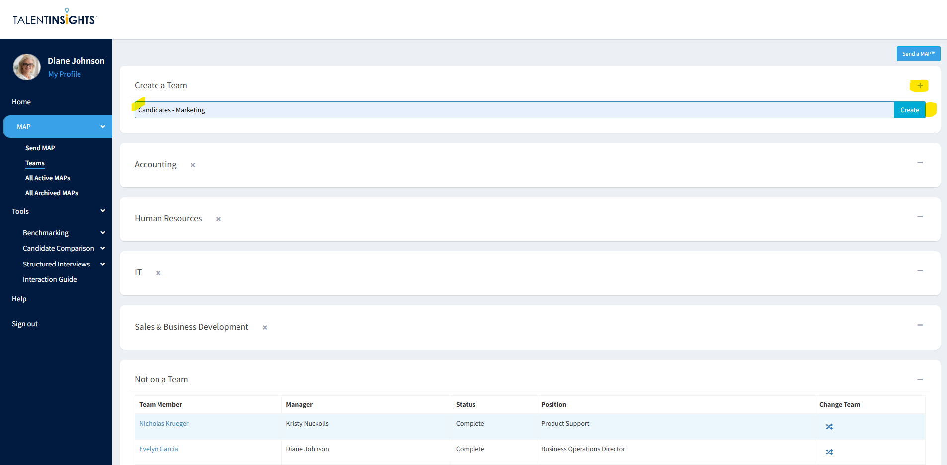You can organize User profiles in your Account into Teams. You can create Teams for organizational departments like Human Resources, IT, and Sales. You may also find it useful to create Teams corresponding to job postings, to organize the profiles for candidates.