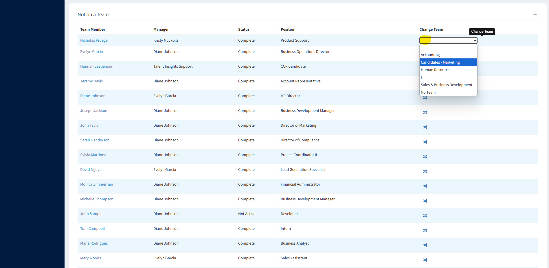 Note: Users with the access level of “Manager” can see the the names of participants who are assigned to Teams. However, they can only open and view the profiles of participants for whom they are assigned as a Manager.